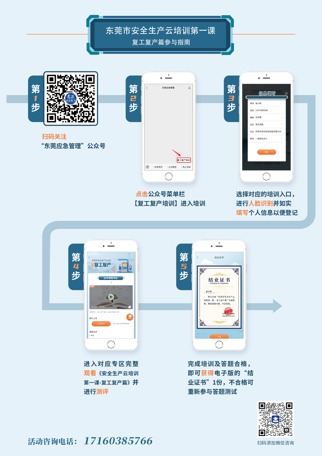 參與指南:關(guān)注“東莞應(yīng)急管理”公眾號,通過點(diǎn)擊公眾號菜單欄【線上活動→復(fù)工復(fù)產(chǎn)培訓(xùn)】,登記個人信息,完成注冊后,點(diǎn)擊“我要參加”進(jìn)入培訓(xùn)內(nèi)容界面,點(diǎn)擊觀看視頻進(jìn)行學(xué)習(xí)。